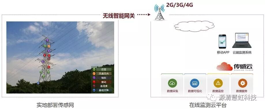 铁塔结构监测系统整体架构分为实地部署的传感网和在线监测云平台两部分。